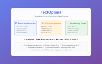 TextOptima는 콘텐츠 제작자, SEO 전문가 및 마케터를 위해 설계된 강력한 Chrome 확장 프로그램입니다. 이 무료 도구는 검색 엔진 가시성과 가독성을 개선하기 위한 다양한 기능을 제공합니다. 사용자는 중복 구문을 분석하고, 표절을 확인하며, 키워드 사용을 평가할 수 있습니다. 이 확장 프로그램은 개인 정보를 보장하기 위해 로컬 알고리즘을 사용하므로 데이터가 업로드되거나 공유되지 않으며, 이는 민감한 콘텐츠에 필수적입니다.
